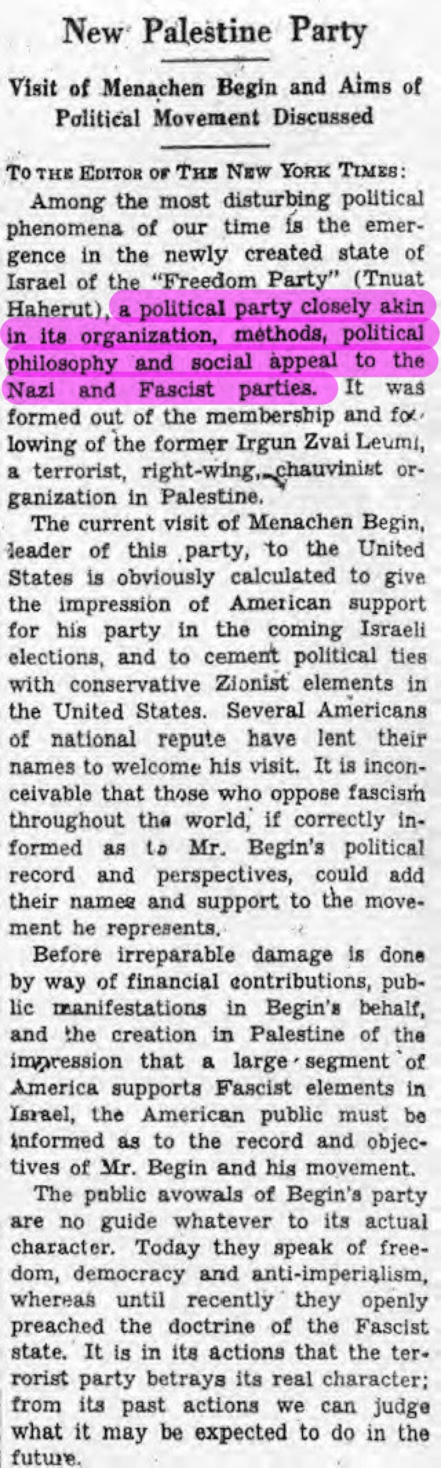 “The Arabs bore no responsibility for the centuries-long suffering of Jews in Europe,” Elon wrote, voicing criticism that is common in Israel today but was rare at the time. “Whatever their subsequent follies and outrages might be, the punishment of the Arabs for the sins of Europe must burden the conscience of Israelis for a long time to come.” -- Quote from Amos Elon from his 2014 obituary in Los Angeles Times.